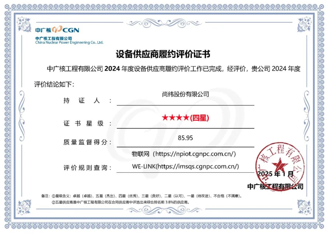 中广核工程有限公司根据《设备供应商年度绩效评级规则》对供应商的项目管理能力、主动性及配合度、质量控制能力、资源配置能力、现场服务能力等多方面进行评价。尊龙凯时股份最终质量监督得分为85.95分,获评为四星(优秀)设备供应商,该项荣誉的获得是对尊龙凯时股份过去一年产品品质的高度肯定,也是对公司未来发展的一种鼓舞。